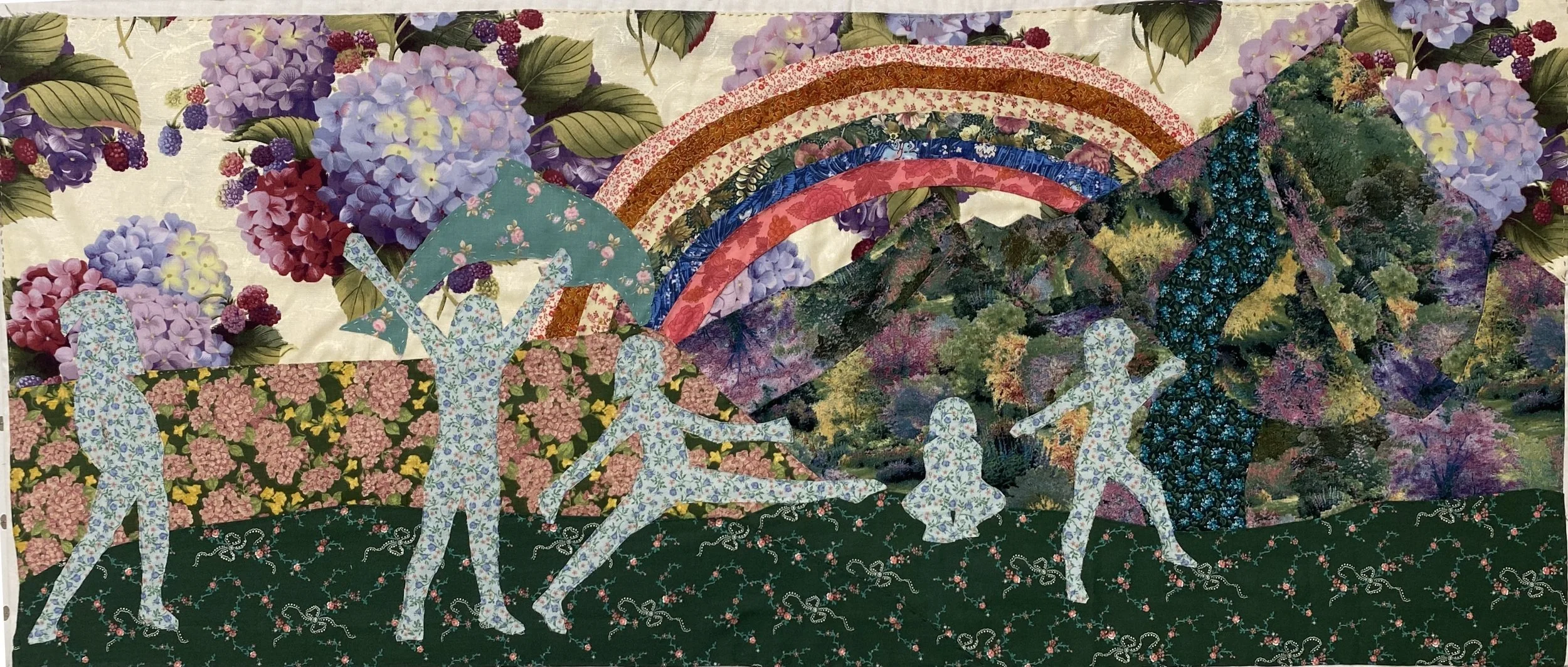 “The Girl In Her Utopian Paradise, All Alone Forever is a 39 x 17 in panoramic hand-sewn textile piece that depicts a small girl frolicking through her utopia all alone. The title of the piece is purposely long because it humorously accompanies the extra long piece. The repetition of this girl categorizes the piece under the synoptic narrative. My intention behind The Girl In Her Utopian Paradise, All Alone Forever was to explore my idea of paradise through my favorite medium, textile.